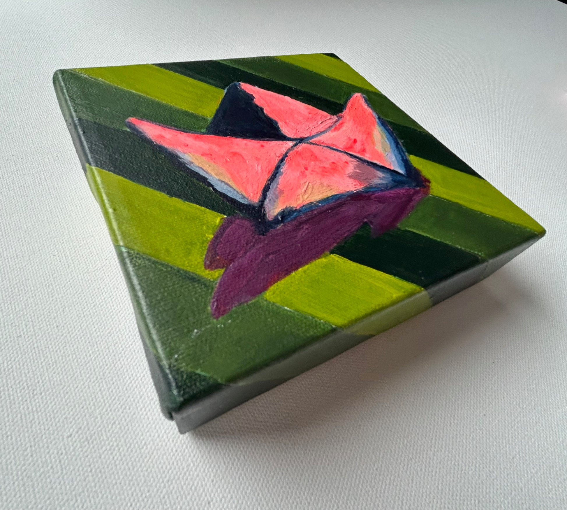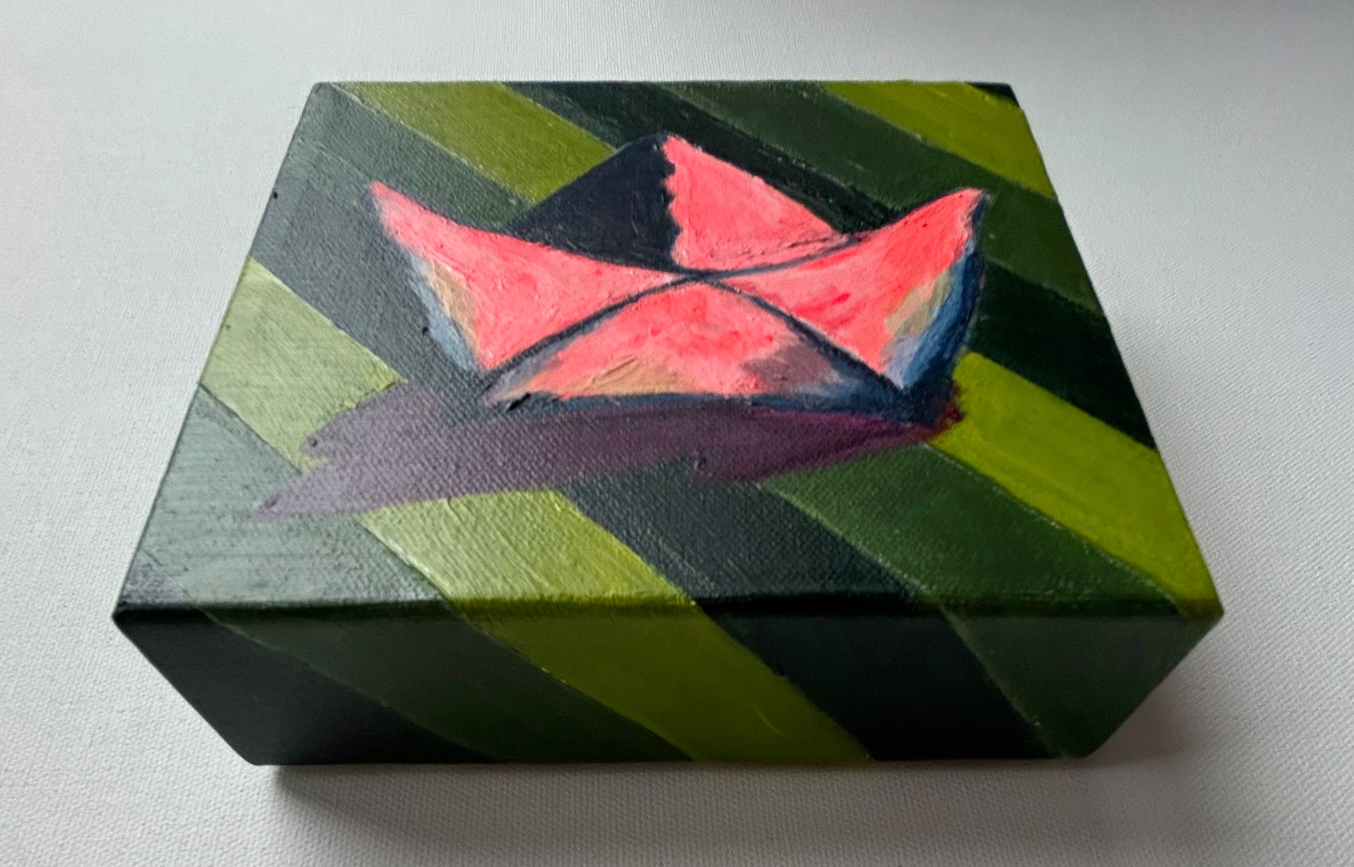 Inspired by the paper hat in Homer's Odyssey, this little mini gives the hat its' standalone presence that it deserves. The thick impasto paint models this paper hat with form and rich colour tones. THe green striped background is a cheeky nod to the tilework that is found in Hocus, Pocus, Calliopus.