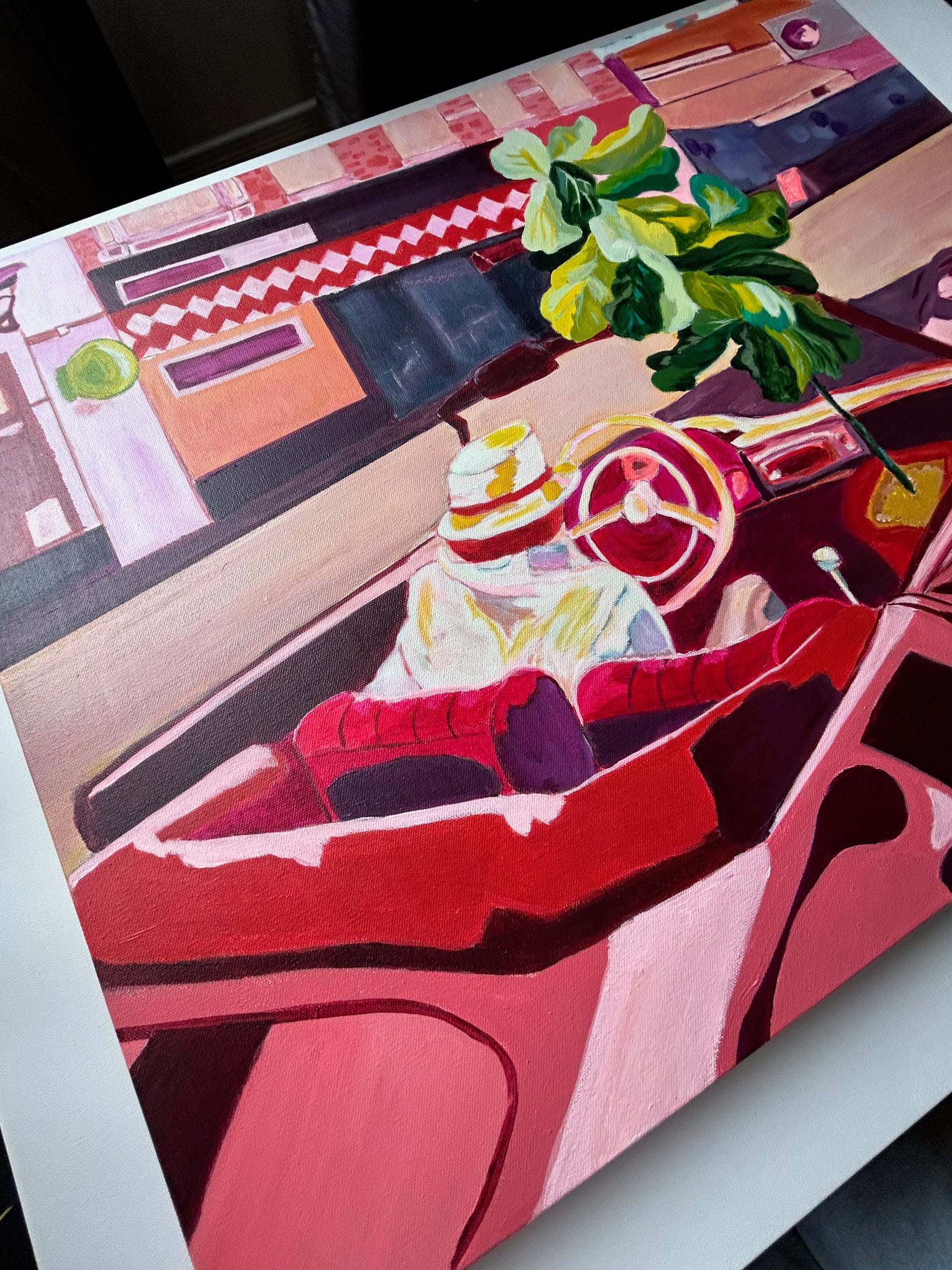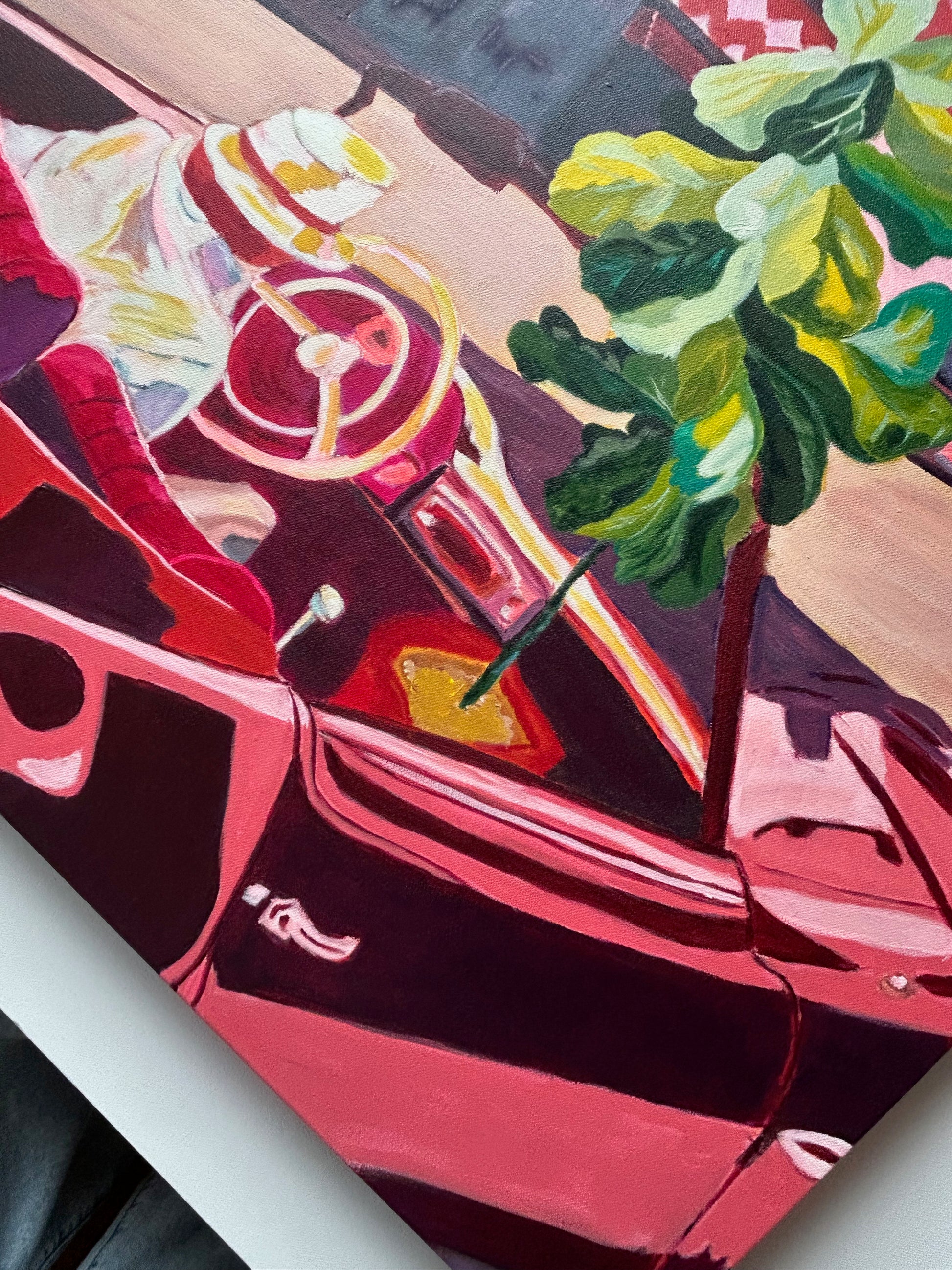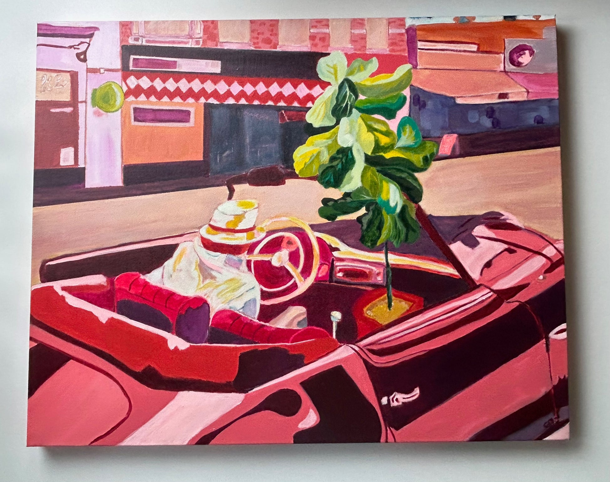 The setting is of course, none other than Bank Street, in the Glebe. A man in a crisp white shirt and a cream hat driving a 1950 convertible Chevy Belair and absconding away with a fiddle leaf fig tree.ย