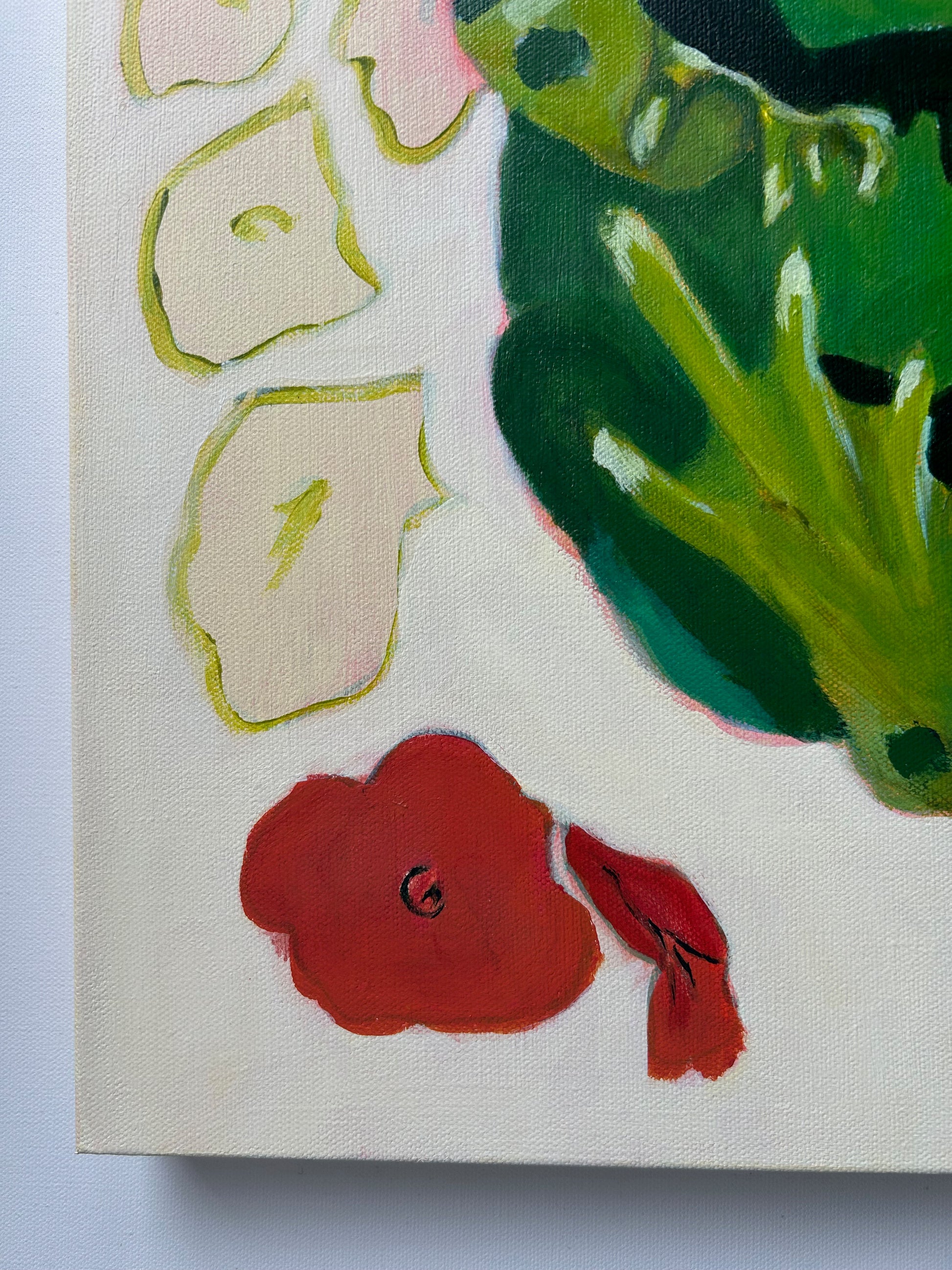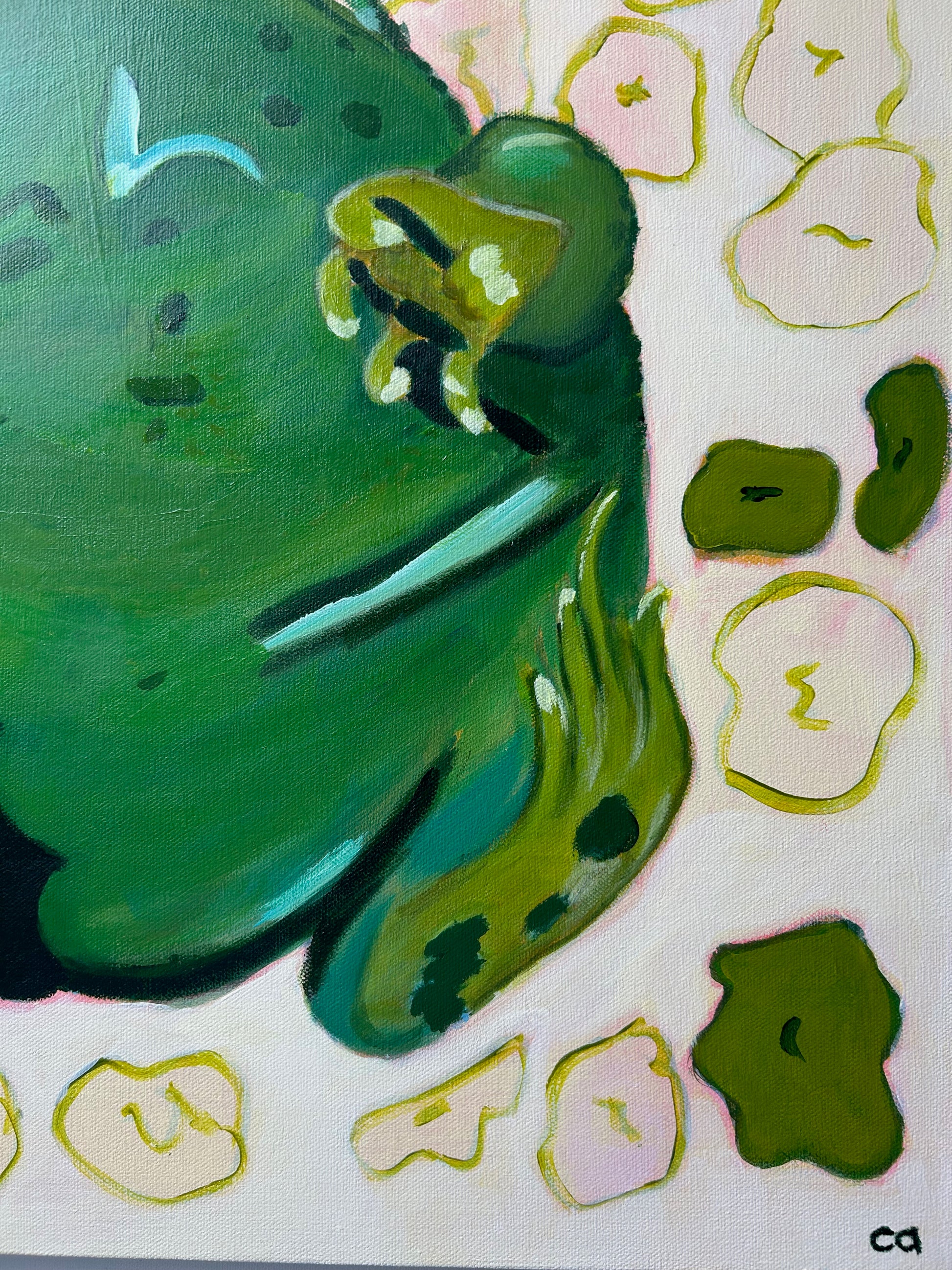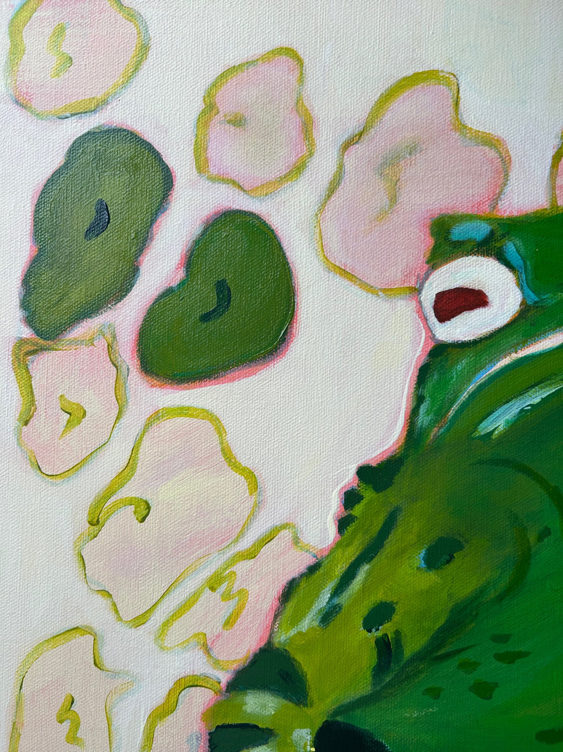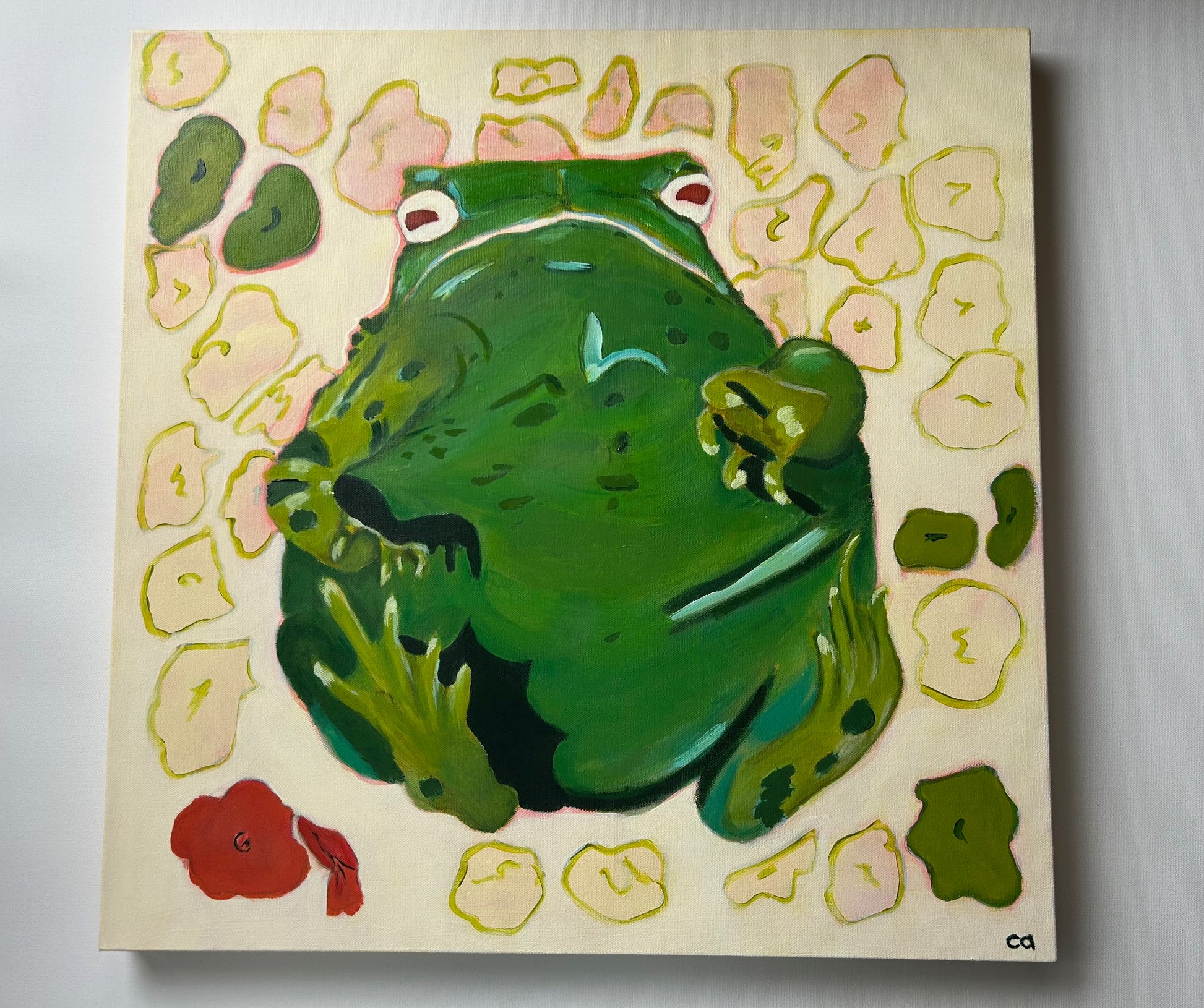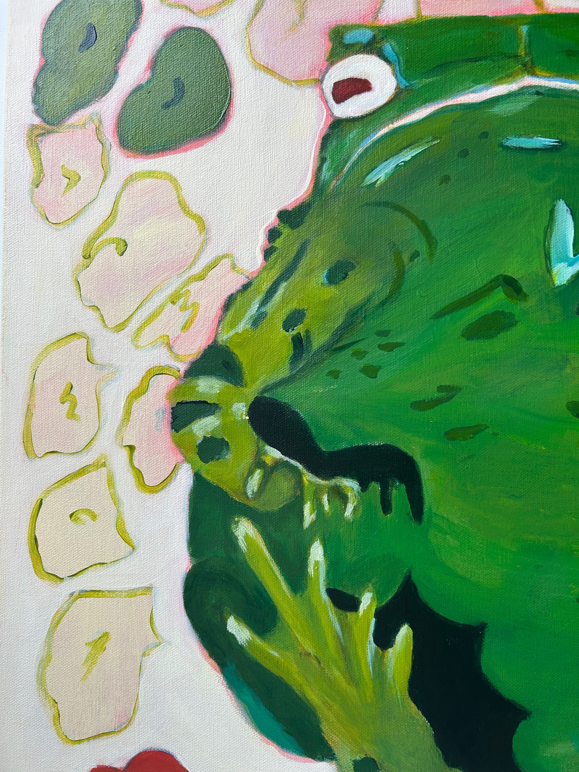 This monumental and very serious toad has not a care in the world. Sitting squatly, no fear, just chill. I am forever chasing looseness in my style, and this piece captures that with the flowers that were formed at the first pass of this painting, complete with the underpainting showing through. Playing with large sizes and giant form, this toad is 1.5 ft tall and wide, it's just another way to highlight the tiny things around us and give them the stage, up front and centre.